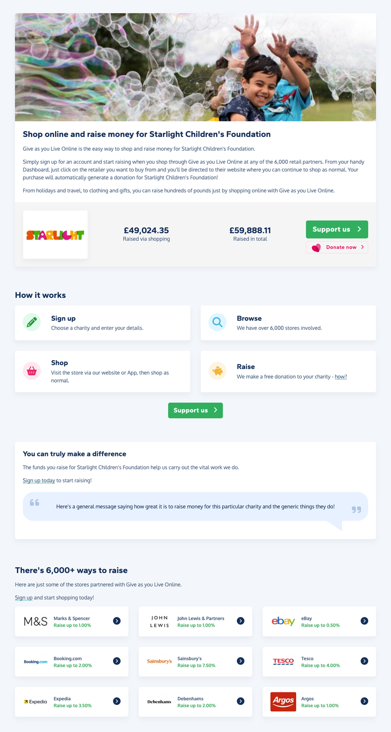 Our online branded pages are mobile friendly webpage which explains to your supporters exactly how Give as you Live Online works.